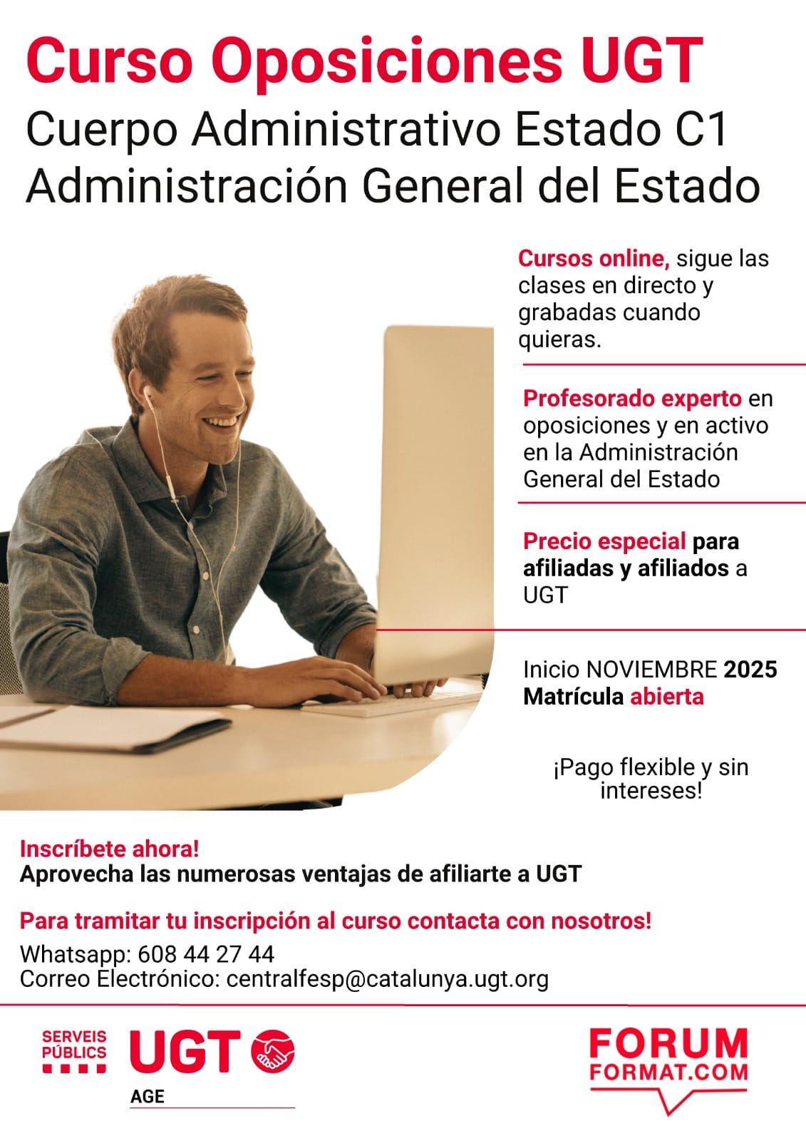 Curso Oposiciones UGT Cuerpo Administrativo Estado C1 Administración General del EstadoCursos online, sique las clases en directo y grabadas cuando quieras.Profesorado experto en oposiciones y