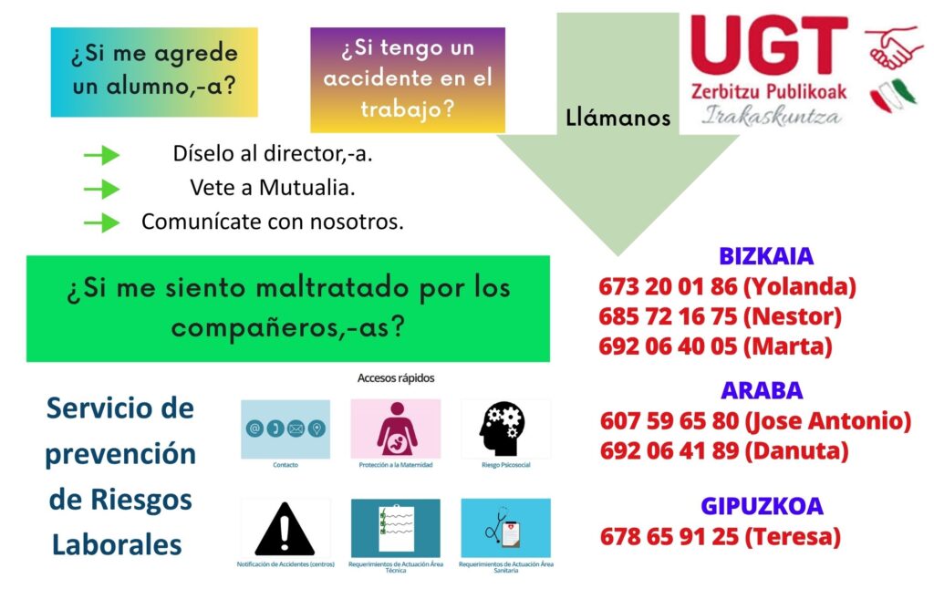 Zure ikastetxean tratu txarren egoeran bazaude, ikasle batek erasotzen badizu, lanean istripuren bat baduzu edo lanerako bidean bazaude… Laneko Arriskuen Prebentziorako Zerbitzura jo behar dugu.