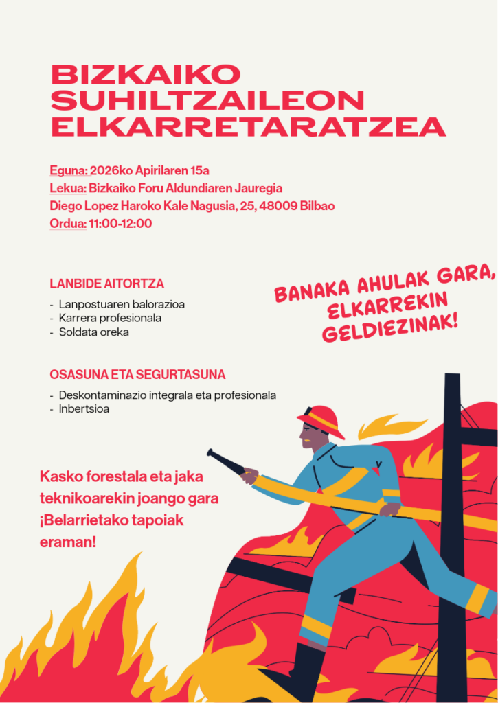 UGT Zerbitzu Publikoak ha llamado a secundar la movilización del personal del Servicio de Prevención, Extinción de Incendios y Salvamento de Bizkaia que tendrá lugar el próximo miércoles, 15 de abril, de 11:00 a 12:00 horas, frente al Palacio de la Diputación Foral (Gran Vía 25, Bilbao). Bajo el lema «Separados somos débiles, juntos ¡imparables!», el colectivo busca visibilizar las carencias que consideran críticas para la seguridad y la dignidad en la prestación del servicio.
